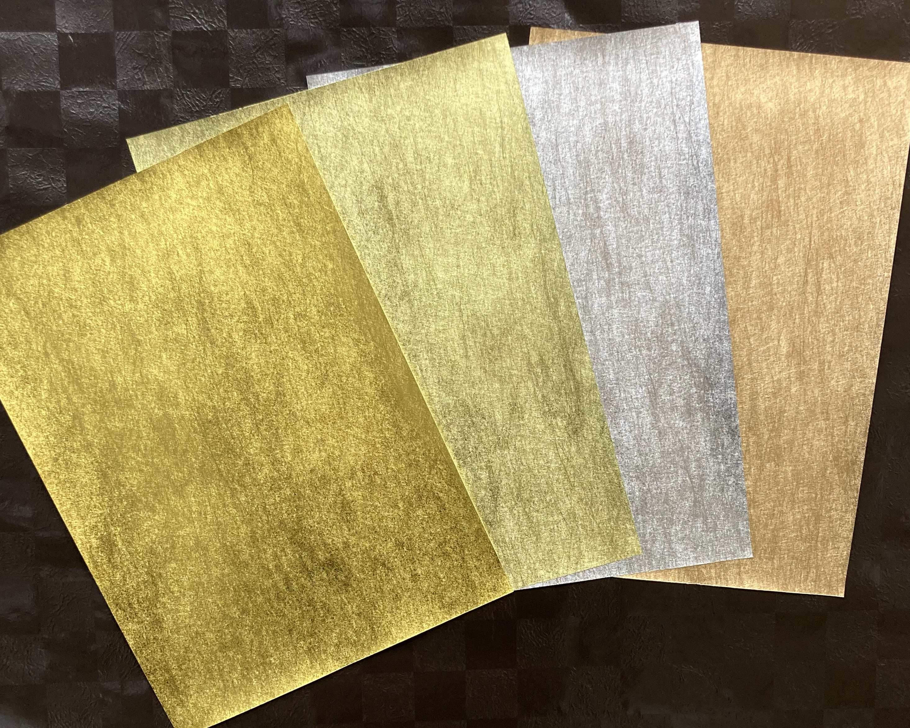 当社の高級金銀紙「神楽」は、特殊なエンボス加工を施すことで、和紙のような質感と立体感のあるメタリック模様を生み出しました。
